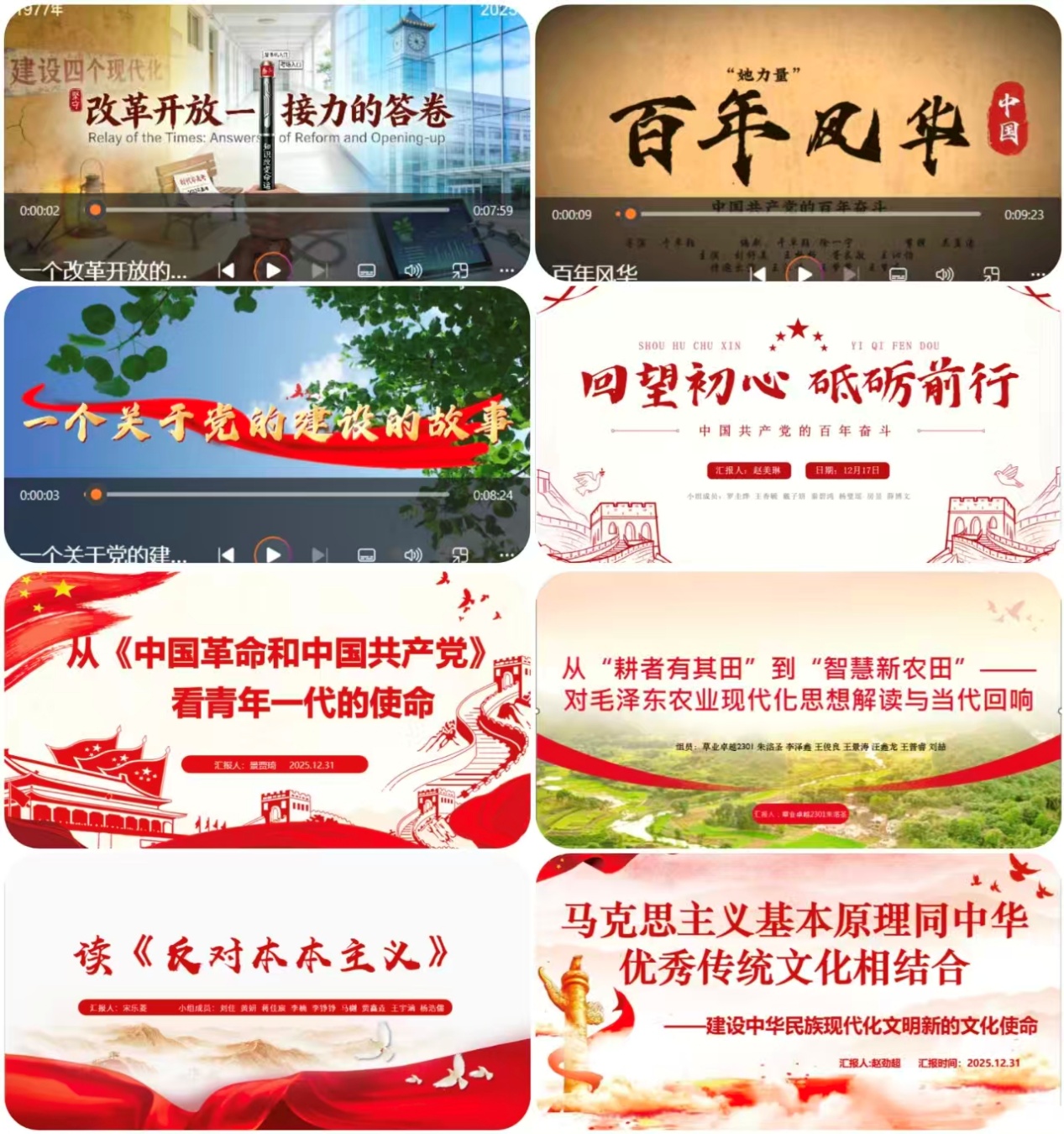 在此导向下,草业班的同学们充分发挥主体作用,呈现出令人欣喜的创作热情与思考深度。涌现的作品题材广泛,形式多样,既有严谨深刻的文字论述,也有生动活泼的视听呈现。特别值得一提的是,部分同学将理论思考融入艺术创作,自编、自导、自演了主题短视频。这些视频作品虽然拍摄手法略显青涩,演员表演也带着青春的质朴,但其真挚的情感、用心的构思和努力用年轻人喜闻乐见的方式诠释理论的尝试,在课堂展映时赢得了同学们的广泛喜爱与共鸣。大家在会心的欢笑与真切的感动之余,更对作品所探讨的理论要点、历史瞬间或现实议题产生了深入的思考和讨论,实现了知识传授、情感共鸣与价值引领的有机统一。比如:《从“耕者有其田”到“智慧新农田”》生动勾勒了中国农业从土地革命到现代农业科技应用的沧桑巨变,体现了学生对“三农”问题历史脉络与当代出路的深刻把握。《一个改革开放的故事》以小见大,通过同学们的动人演绎,深情讲述了改革开放波澜壮阔历程中的生动细节与奋斗精神。