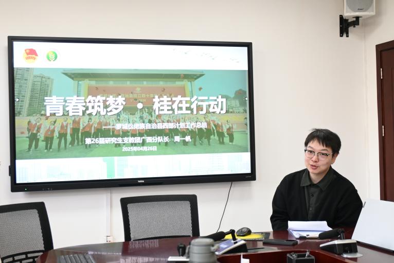 在分享交流环节,三位拥有丰富志愿服务经历的团员青年依次分享了各自的亲身实践与深刻感悟。来自食品工程学院25级研究生、第26届研究生支教团广西分队队长周一帆,以“‘6+1’个‘行’·吹响青春建功仫佬山乡集结号”为主题展开分享。他详细讲述了自己与广西分队成员,在心理健康教育、文化交流与民族团结、爱国教育宣讲、乡村振兴与社会服务等多个领域开展的系列优秀志愿服务事迹,生动展现了青年志愿者扎根基层、奉献青春的责任担当。最后,他向在座团员发出倡议,呼吁大家坚守初心、勇担使命,以青春之名凝聚志愿力量,用实际行动书写新时代青年的奋进风采。