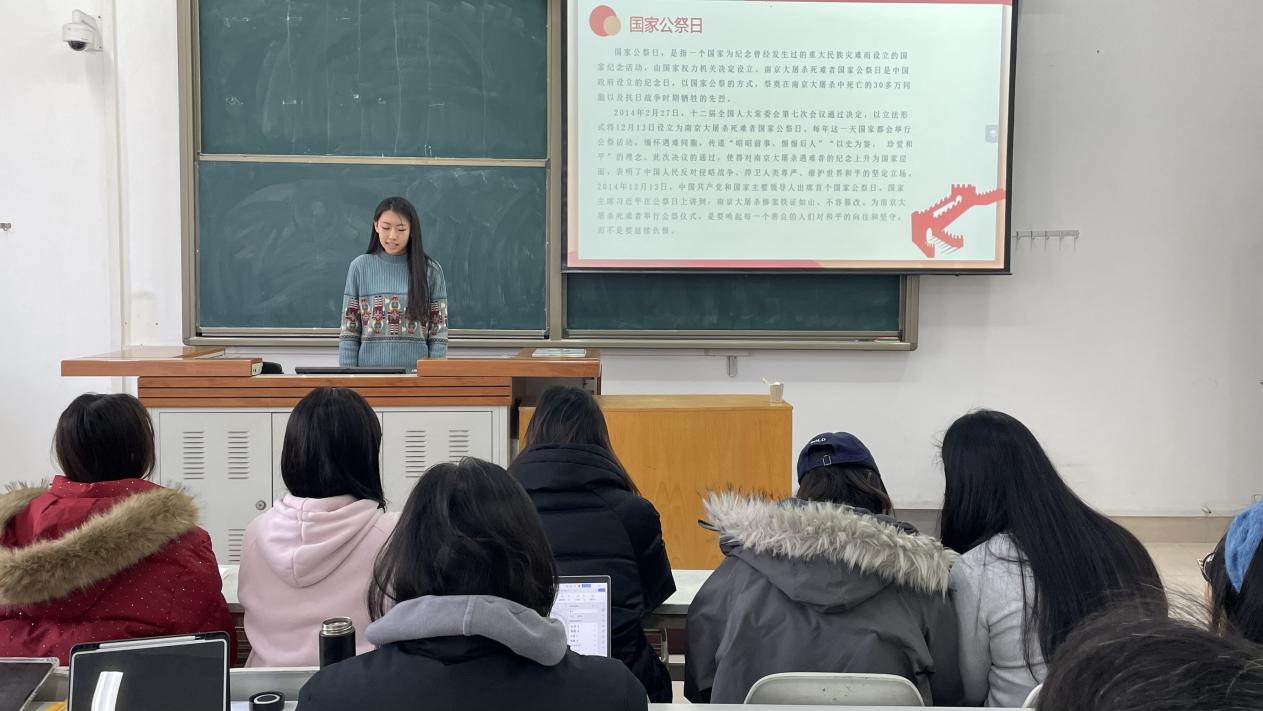 张楚研同学首先通过PPT形式领学了南京大屠杀的历史和国家公祭日的来由,带领大家仔细研读了两篇关于南京大屠杀死难者国家公祭日的报道,帮助同学们深化对历史的认识,引导大家从历史中汲取奋进力量,进一步筑牢信仰之基。