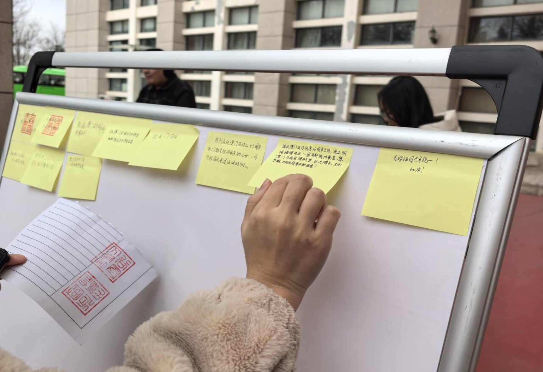 环节三:同学们将对澳门的美好祝愿、对祖国的赤诚热爱落笔于便利贴,逐一贴满“寄语墙”。