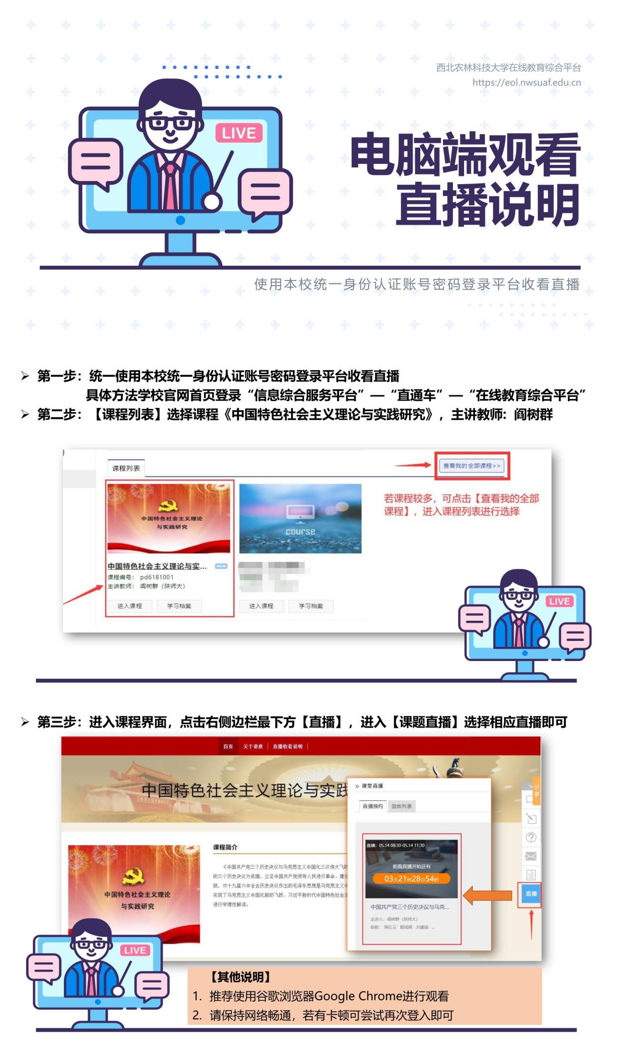 课程助教(任课老师)及2022春季中特课选课学生统一使用本校统一身份认证账号密码登录平台收看直播。具体方法:西北农林科技大学 官网首页登录“信息综合服务平台”——“直通车”——“在线教育综合平台”