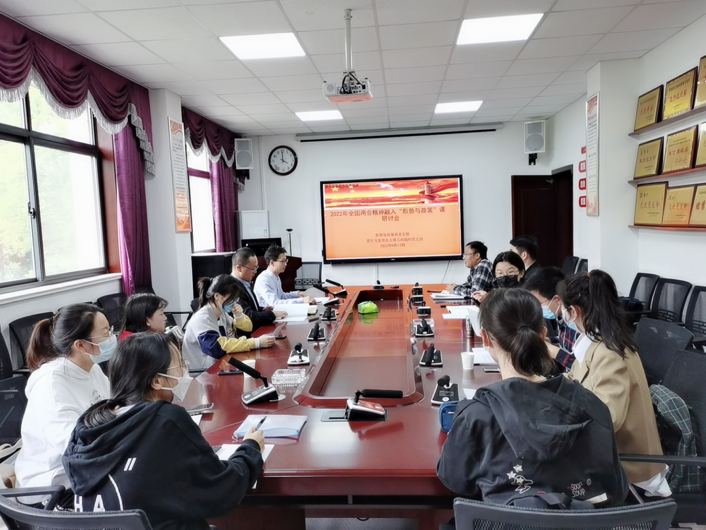 随着2022年全国两会落下帷幕,新学期的“形势与政策”课即将全校开讲。4月13日,马克思主义学院形势与政策系党支部与青年马克思主义研习社(南校)临时党支部开展师生支部对接联谊,围绕2022年全国两会精神融入“形势与政策”课在马克思主义学院208会议室举行了专题研讨会。研讨会由周岑银老师主持,参会师生代表15人。