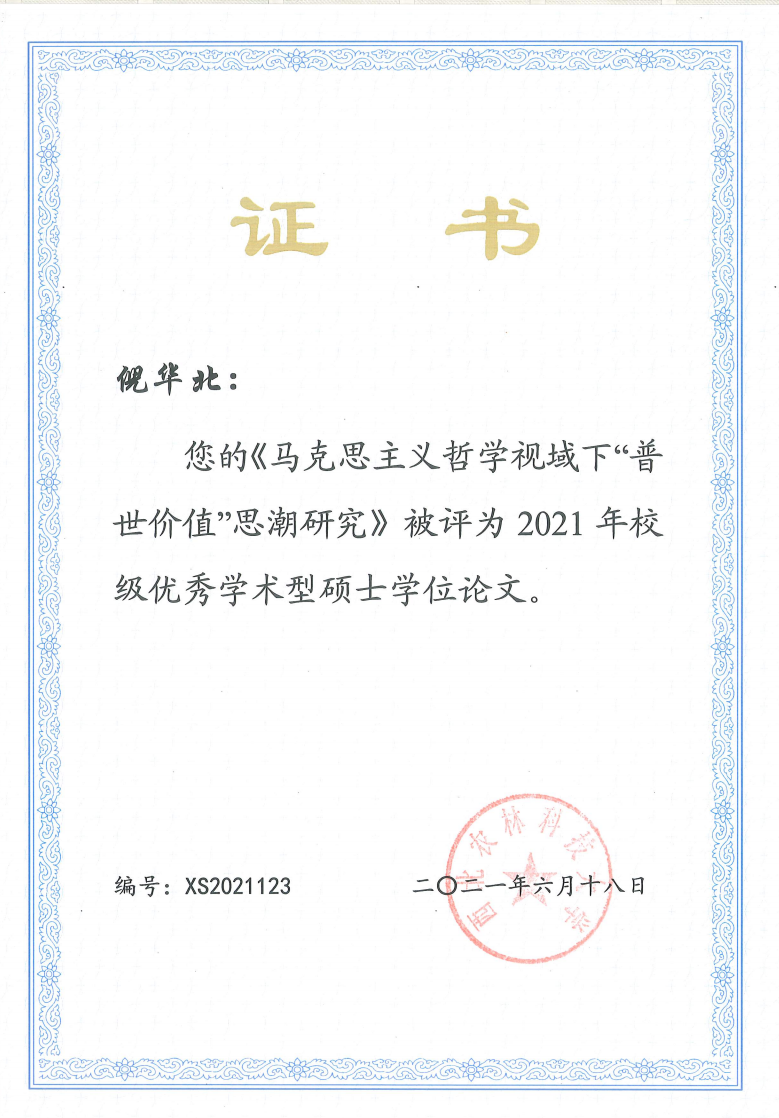 根据《西北农林科技大学研究生优秀学位论文评选及奖励办法》(校研发〔2021〕159号)和《关于做好我校2021年研究生优秀学位论文评选工作的通知》要求,经个人申请、导师推荐、分委会组织专家评审、公示、分委会审议、学校组织专家评审和6月18日第十一届校学位评定委员会第十一次会议审核通过,学校公布了获奖名单。学院郭洪水教授指导的2018级硕士倪华北的学位论文《马克思主义哲学视域下“普世价值”思潮研究》获评校级优秀学术型硕士学位论文,进一步证明了我院导师和学生在马克思主义理论学科的研究领域刻苦钻研,不断取得新的成绩。