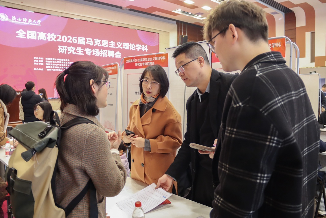 3月21日,由陕西师范大学招生就业处主办,陕西师范大学马克思主义学院承办,西安交通大学、西北工业大学、西北农林科技大学、西安电子科技大学、长安大学、西北大学等高校马克思主义学院共同联办的“全国高校2026届马克思主义理论学科研究生专场招聘会”在陕西师范大学长安校区举行。学院院长杨鹏带队参加了此次招聘会。